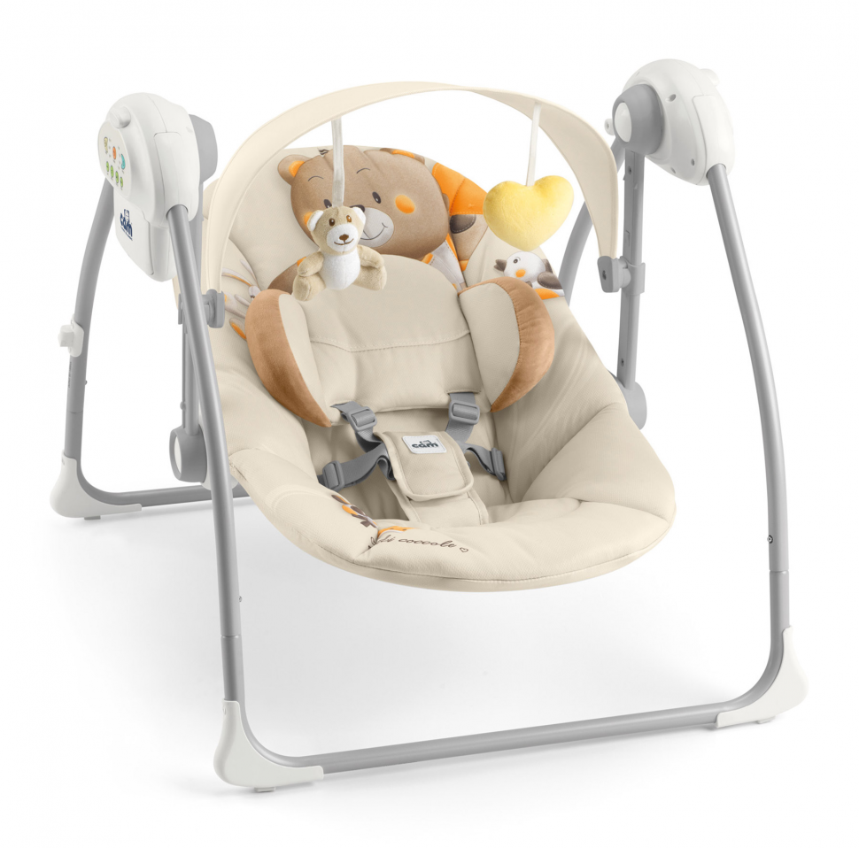 Качели Cam Sonnolento – лёгкая переносная колыбелька для укачивания младенца под расслабляющую музыку или под звуки природы. Ложе правильной анатомической формы с мягким подголовником закреплено на основании с прорезиненными упорами, надёжно стоящем на любой ровной поверхности. Под козырьком от солнца прикреплены игрушки, которые развлекут малыша пока он бодрствует, а размеренное покачивание с настраиваемой скоростью – позволит младенцу сладко высыпаться, чтобы он мог расти здоровым и весёлым. Шезлонг можно брать с собой в поездки, в гости или на природу, благодаря его небольшому весу – 4 килограмма и компактному складыванию.