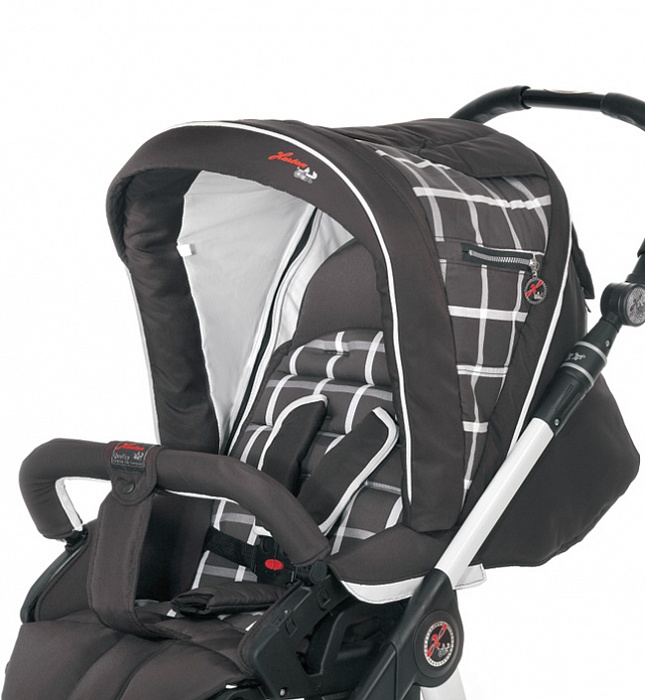 Шасси выполнено из легкого алюминия и складывается «книжкой». Передние поворотные колеса шасси блокируются, обеспечивая коляске отличную маневренность. Задние колеса фиксируются ножным тормозом, который сконструирован так, чтобы не пачкать обувь родителей. Телескопическая ручка с эргономичными накладками регулируется под рост мамы и папы. Докупив специальные адаптеры, на шасси можно устанавливать автокресла бренда Hartan.