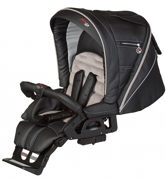 Детская коляска 2 в 1 Hartan Xperia XL – стильный и практичный модульный комплект для использования с рождения и до 3-4 лет. Состоит из люльки для новорожденного и прогулочного блока, попеременно заменяемых на шасси с современным дизайном и функционалом. Классическая люлька с жестким ортопедическим дном, выстланным кокосовым матрасиком, сконструирована с учетом всех анатомических особенностей младенца. Большой капюшон целиком укомплектован для защиты крохи, находящегося внутри люльки, как от палящих солнечных лучей с уф-излучением, так и от непогоды. Компактность и мобильность люльки по достоинству оценят родители, которые любят путешествовать налегке, люлька имеет опцию складывания до плоского состояния и удобную ручку для переноски. Вместительный прогулочный блок используется для комфортной перевозки маленьких пассажиров, которые уже умеют держать спинку и сидеть. Установить сидение можно как по ходу движения, так и против него, в зависимости от насущной необходимости. Наклон спинки изменяется до полностью горизонтального положения, предназначенного для отдыха малыша. Широкий капюшон прогулочного блока можно с лёгкостью складывать и раскладывать, а задняя его часть отстёгивается частично или полностью, превращая коляску в летний, хорошо проветриваемый вариант с тентом от солнца. Для зимних прогулок в комплект включена утеплённая накидка на ножки. Шасси коляски произведено из легкого алюминия и имеет тип сложения «книжка». Передние поворотные колеса, не смотря на высокую маневренность, имеют опцию блокировки в положении «прямо» - для обеспечения коляске лучшей проходимости. Задние колеса фиксируются ножным тормозом, который сконструирован так, чтобы не пачкать обувь родителей. Телескопическая ручка с мягкими нескользящими под руками накладками на ней регулируется под разный рост, будь то рост мамы или папы. В комплекте с модульной коляской - сумка для маминых вещей в том же дизайнерском исполнении, что и весь набор транспортных средств. При помощи дополнительных адаптеров на шасси можно устанавливать автокресла бренда Hartan.