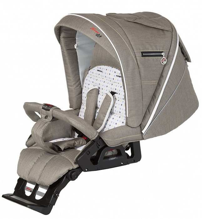 Детская коляска 2 в 1 Hartan Xperia XL – стильный и практичный модульный комплект для использования с рождения и до 3-4 лет. Состоит из люльки для новорожденного и прогулочного блока, попеременно заменяемых на шасси с современным дизайном и функционалом. Классическая люлька с жестким ортопедическим дном, выстланным кокосовым матрасиком, сконструирована с учетом всех анатомических особенностей младенца. Большой капюшон целиком укомплектован для защиты крохи, находящегося внутри люльки, как от палящих солнечных лучей с уф-излучением, так и от непогоды. Компактность и мобильность люльки по достоинству оценят родители, которые любят путешествовать налегке, люлька имеет опцию складывания до плоского состояния и удобную ручку для переноски. Вместительный прогулочный блок используется для комфортной перевозки маленьких пассажиров, которые уже умеют держать спинку и сидеть. Установить сидение можно как по ходу движения, так и против него, в зависимости от насущной необходимости. Наклон спинки изменяется до полностью горизонтального положения, предназначенного для отдыха малыша. Широкий капюшон прогулочного блока можно с лёгкостью складывать и раскладывать, а задняя его часть отстёгивается частично или полностью, превращая коляску в летний, хорошо проветриваемый вариант с тентом от солнца. Для зимних прогулок в комплект включена утеплённая накидка на ножки. Шасси коляски произведено из легкого алюминия и имеет тип сложения «книжка». Передние поворотные колеса, не смотря на высокую маневренность, имеют опцию блокировки в положении «прямо» - для обеспечения коляске лучшей проходимости. Задние колеса фиксируются ножным тормозом, который сконструирован так, чтобы не пачкать обувь родителей. Телескопическая ручка с мягкими нескользящими под руками накладками на ней регулируется под разный рост, будь то рост мамы или папы. В комплекте с модульной коляской - сумка для маминых вещей в том же дизайнерском исполнении, что и весь набор транспортных средств. При помощи дополнительных адаптеров на шасси можно устанавливать автокресла бренда Hartan.