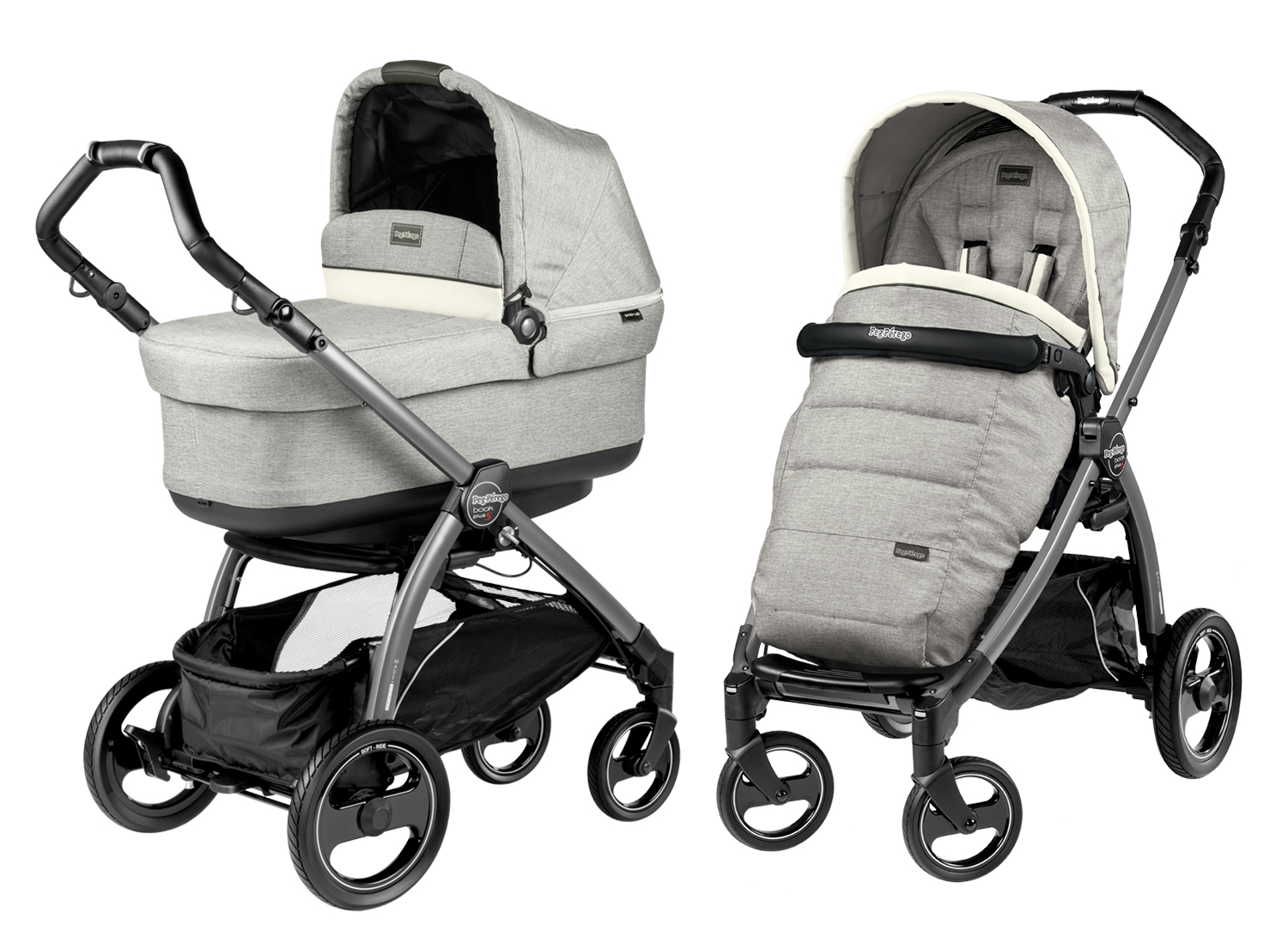 Коляска 2 в 1 Peg Perego Book Plus S Modular с люлькой Navetta Pop-Up - прекрасная модульная система, которая с легкостью заменит две отдельные коляски, сэкономив семейный бюджет. Ее единое высокопрочное алюминиевое шасси обладает универсальной системой крепления Ganciomatic, что позволяет крепить оба съемных модуля реверсивно, а также устанавливать дополнительно приобретенное автокресло Primo Viaggio Tri-Fix. Имеется регулируемая по высоте эргономическая ручка и вместительная грузовая корзина. Для большей проходимости предусмотрен дополнительный протектор на колесах.