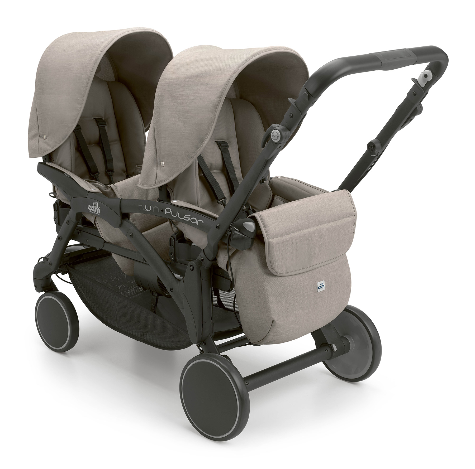 Прогулочные блоки устанавливаются на шасси «паровозиком». Модули можно закрепить лицом к маме, лицом к улице, и (что является особенностью модели итальянского бренда Cam) лицом друг к другу. Детям будет комфортно в коляске благодаря регулирующимся спинкам и подножкам. Объёмные высокие капюшоны можно полностью убрать или разложить до жёстких съёмных бамперов.
