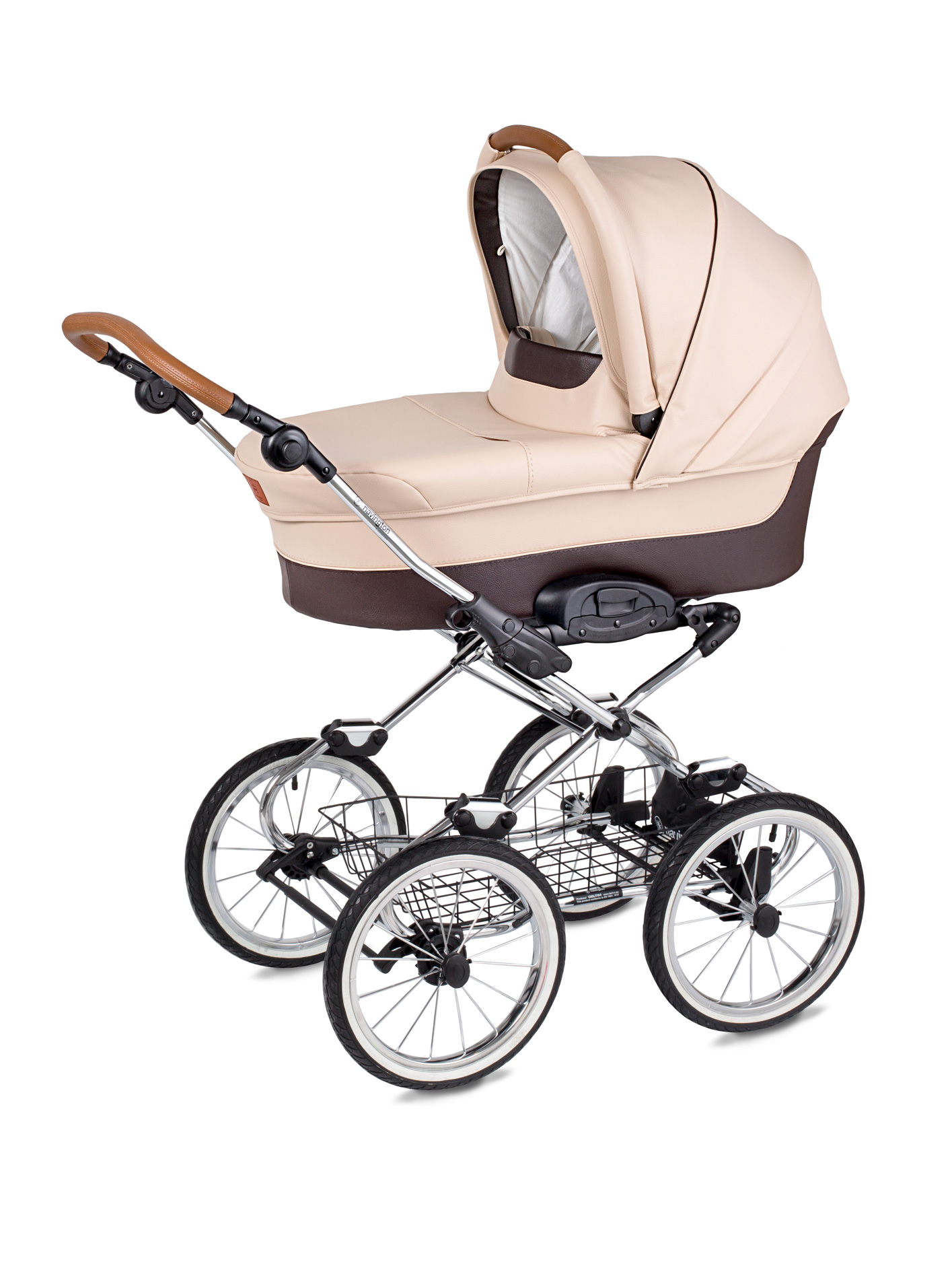 Прочное и лёгкое шасси дополнено надувными колёсами со спицами. Передние колёса – поворотные, их можно зафиксировать в положении "прямо" при езде по зыбкому грунту. На всех колёсах есть амортизация, что позволяет сглаживать вибрацию и тряску при преодолении неровностей на дороге. Рама легко складывается книжкой, для большей компактности можно быстро отстегнуть и убрать во вместительную корзину все колёса. Коляской просто и приятно управлять благодаря регулирующейся родительской ручке, обтянутой экокожей.