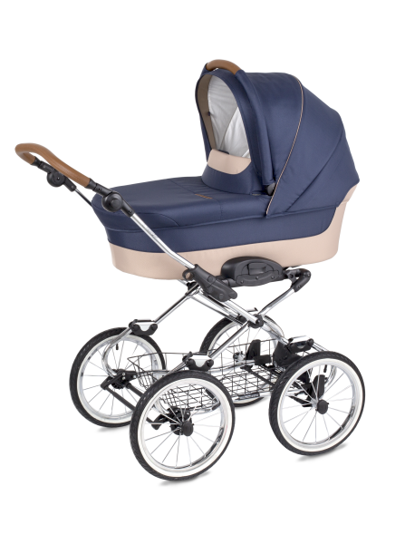 Прочное и лёгкое шасси дополнено надувными колёсами со спицами. Передние колёса – поворотные, их можно зафиксировать в положении "прямо" при езде по зыбкому грунту. На всех колёсах есть амортизация, что позволяет сглаживать вибрацию и тряску при преодолении неровностей на дороге. Рама легко складывается книжкой, для большей компактности можно быстро отстегнуть и убрать во вместительную корзину все колёса. Коляской просто и приятно управлять благодаря регулирующейся родительской ручке, обтянутой экокожей.