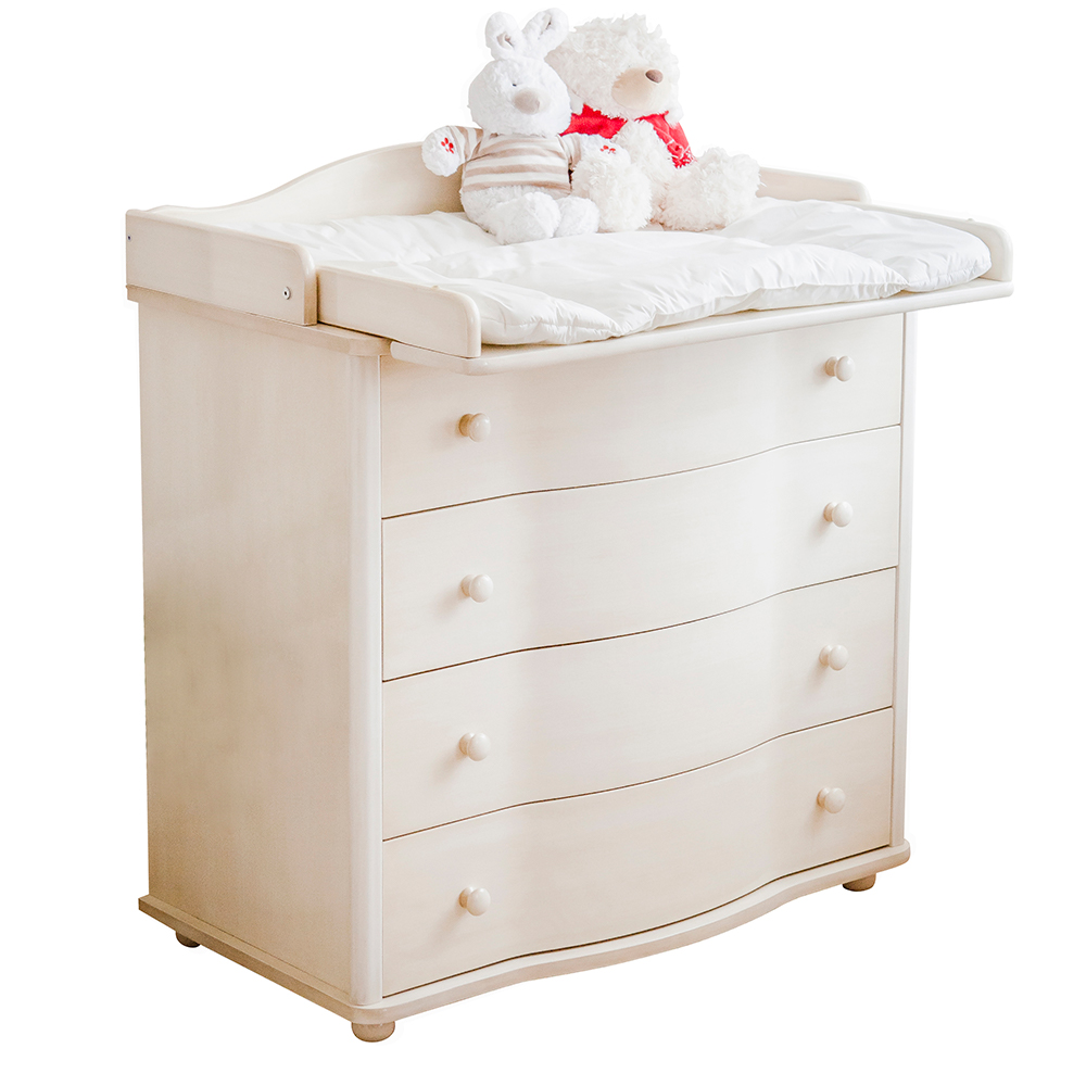 Широкий комод оснащен откидной полкой, что обеспечивает безопасное пеленание малыша. На комоде с пеленальной доской удобно делать массаж, переодевать ребёнка, проводить ежедневные гигиенические процедуры. Кроме того, всегда под рукой необходимые вещи малыша. В 4 глубоких ящиках на шариковых направляющих поместятся все вещи ребенка. На передних гнутых панелях комода 4 пары ручек "грибок" диаметром 35 мм. Эксклюзивный дизайн гнутых панелей комода - настоящая роскошь для изысканного интерьера. Комод сочетает в себе превосходное качество и современный дизайн. Материалы: массив березы; МДФ; передние панели ящиков- гнутоклееная заготовка (береза). Отделка производится красителями на водной основе, применяются безопасные полиуретановые лаки и эмали.