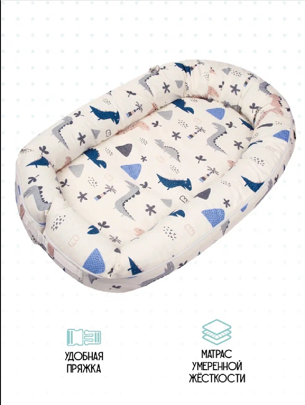 В гнездышке удобно пеленать и переодевать ребенка вне дома. Позиционер можно легко взять с собой в поездку, так как он легко умещается в сумке.