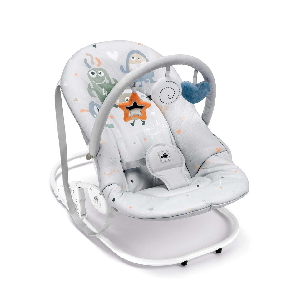 Новинка серии Giocam 2013 года стала еще более комфортной и удобной. Дышащее покрытие данного шезлонга выполнено в нежной цветовой гамме. Он совмещает в себе возможность укачивать вашего малыша, а также выполнять роль кресла в часы бодрствования. На дуге располагаются разнообразные мягкие игрушки, которые позволят ребенку не скучать.