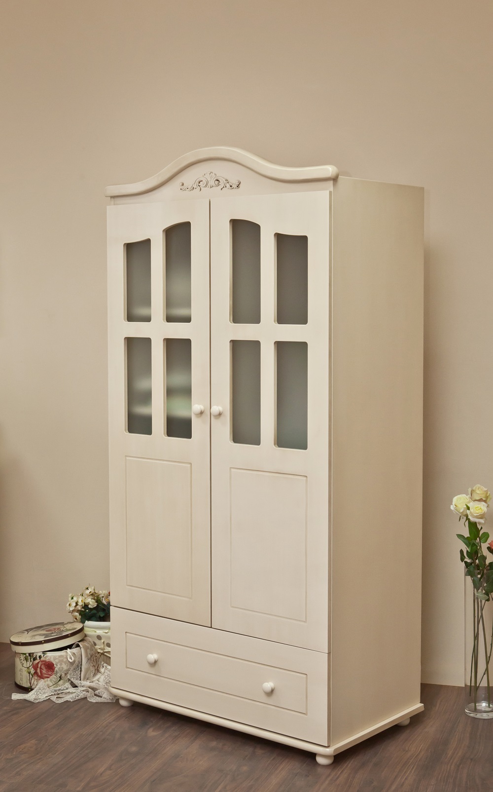 Удобный и стильный шкаф с 2-мя дверками и одним ящиком. Верхняя часть дверок остеклена, в нижней части дверок декоративное оформление в виде фрезерованного паза по периметру. Внутри шкаф разделен на 2 секции - первая оснащена 2-мя штангами, вторая 3-мя полками. Над дверками шкафа установлена декоративная планка, на которую крепится накладка "Пальметта", придающая шкафу изящество. В нижней части установлен углубленный ящик на шариковых направляющих, изготовленный из натуральной древесины. На панели ящика декоративное оформление в виде фрезерованного паза по периметру. Ручки-кнопки деревянные из натуральной древесины, диаметром 35 мм. Шкаф установлен на круглые точеные ножки из натуральной древесины, диаметром 56 мм. Сборка каркаса производится при помощи эксцентриковой и винтовой стяжки.