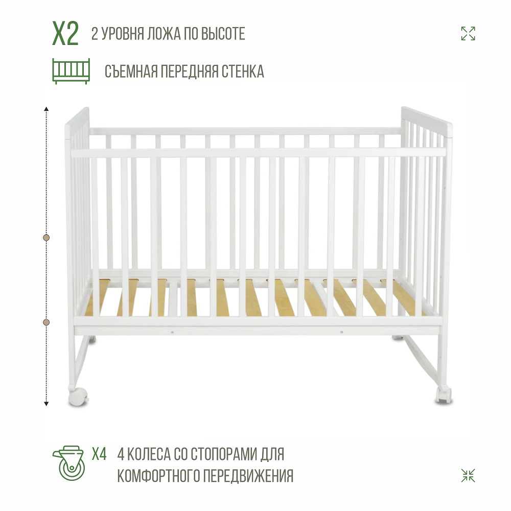Наиболее лаконичная и доступная модель кроватки Sweet Baby Dora является превосходным сочетанием отличного качества и цены! Мы уже постарались и выбрали для вас только самые необходимые функции, которые должны быть в детской кроватке - и ничего лишнего! Массив натуральной берёзы, качественно обработанный и покрытый экологически чистыми лакокрасочными материалами, обеспечит долговечность кровати и уверенность в её надёжности и безопасности для малыша. Два уровня ложа позволят вам удобно трансформировать кроватку в зависимости от возраста вашего ребёнка: используйте верхнее положение для совсем ещё крохотных новорождённых малышей и нижнее положение для тех деток, которые уже начинают самостоятельно вставать на ножки. Функция качалки, заложенная в подножку кроватки, облегчит процесс убаюкивания и погружения в сладкий сон. А мобильные колёсики, прилагающиеся в комплекте, позволят без труда переместить данную модель в ту часть квартиры, которую вы сами посчитаете нужной.