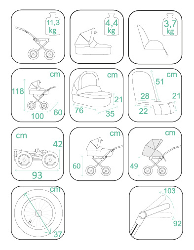 Все прогулочные блоки и люльки выполнены в пяти типах тканей с использованием разнообразных расцветок. Все ткани обработаны специальным водоотталкивающим составом. Первый тип, Сирена, состоит из качественных тканей без использования какого-либо дизайнерского оформления,то есть, они имеют гладкую структуру. Второй тип Люкс, добавляет к оформлению вставки из качественной экокожи. В типе Жаккард используется крупноузорчатая ткань, сложного или простого переплетения. Следующий тип элитного оформления составляют ткани типа Карбон, которые по своей структуре напоминают знаменитое углеводородное волокно. И завершает ассортимент абсолютный лидер рынка - тип Деним, повторяющий свойства прочной и надежной джинсовой ткани.
