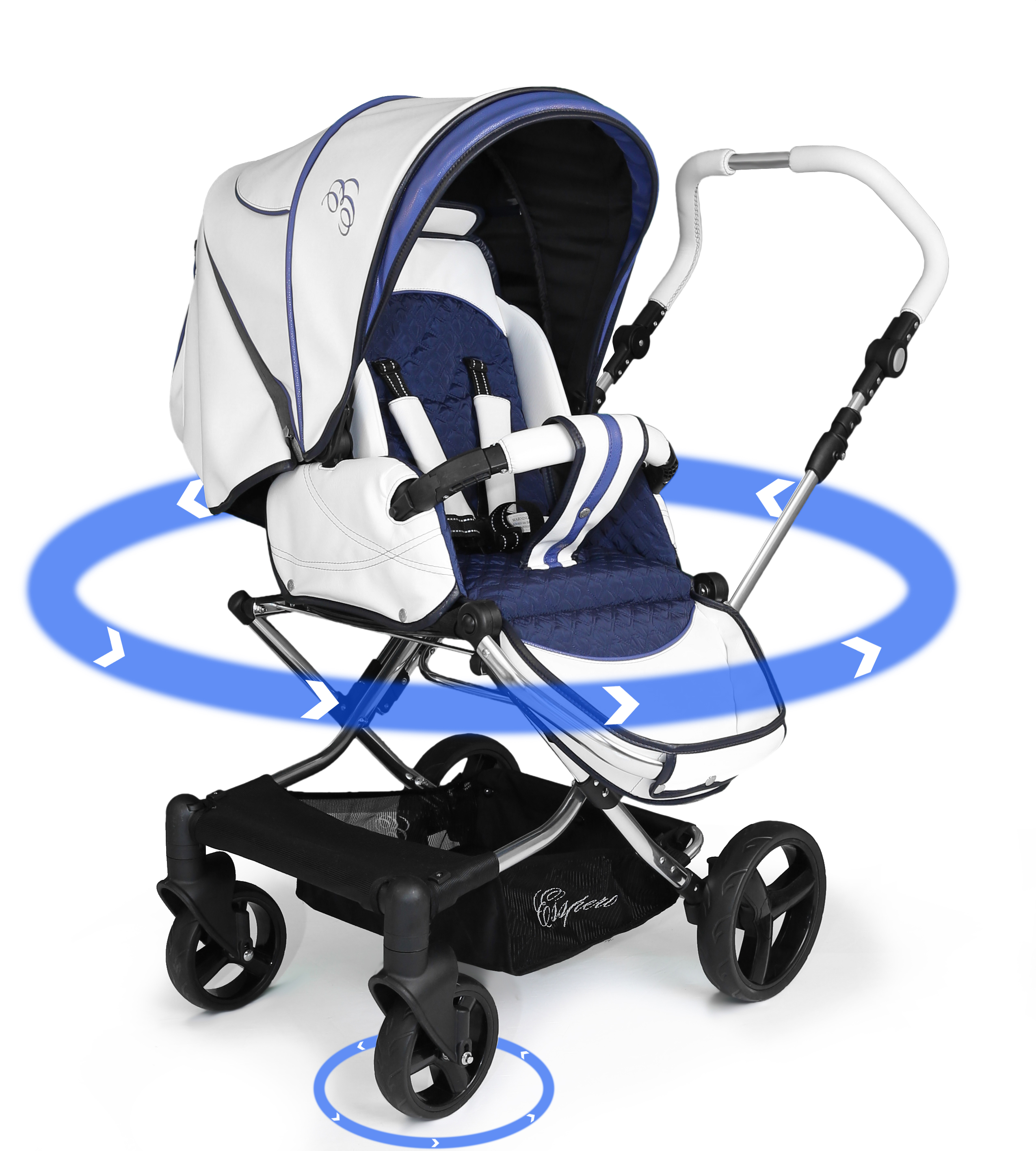 Прогулочная коляска Esspero Reverse limited Edition сделана с использованием высококачественной экокожи и оснащена уникальной возможностью смены направления прогулочного блока без съёма с шасси и перекидывания ручки. Блок можно развернуть даже перпендикулярно шасси, защитив при этом малыша от сильных порывов ветра. Передние колеса коляски вращаются на 360 градусов, имеют амортизаторы, фиксацию в прямом положении и кнопку для быстрого снятия прогулочного блока с рамы. Задние колеса также амортизированы, но ещё более мягко. Все колеса вращаются на подшипнике, за счет чего коляска остается на хорошем ходу в любую погоду.