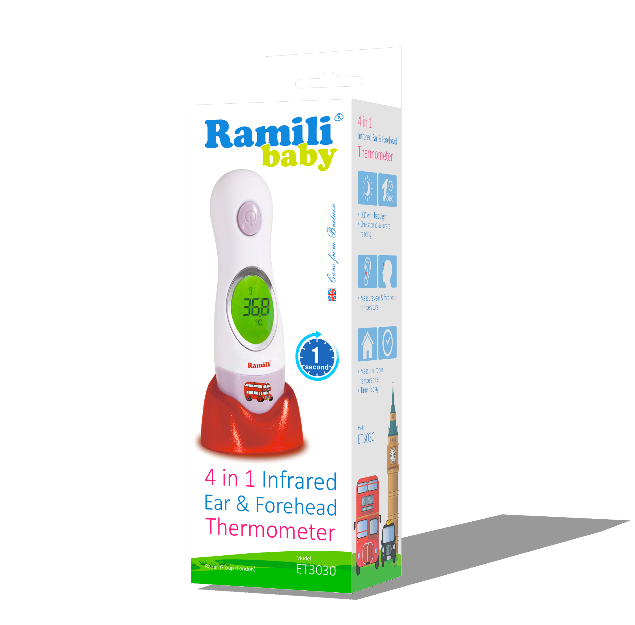Инфракрасный ушной и лобный термометр Ramili ET3030 (4 в 1) удобной формы предназначен для быстрого бесконтактного измерения температуры тела ребёнка. Уже спустя секунду термометр выдаёт вам результат измерения, измерения при этом можно производить двумя способами - при погружении в ухо или приложив ко лбу. В режиме ожидания устройство можно использовать как настольные часы и комнатный термометр.