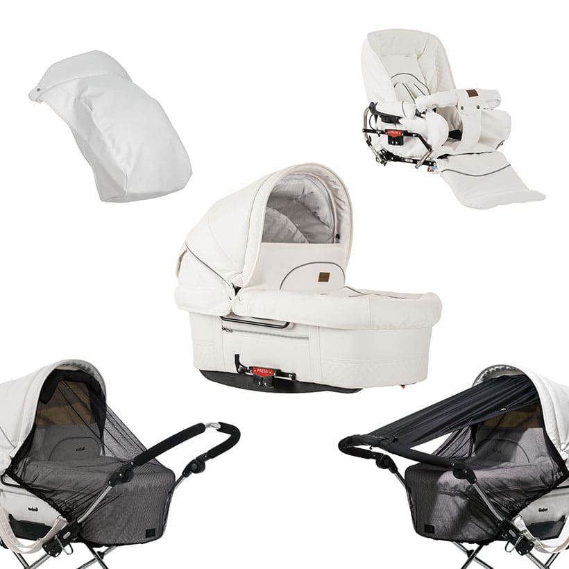 Коляска 2 в 1 Emmaljunga Edge Duo Combi Lounge Pure на шасси Duo S Lounge - популярная транспортная система, выполненная шведским производителем, чтобы не только привлекать внимание окружающих, но также на совесть служить всей семье, только что появившегося на свет малыша в первые три-четыре года его жизни. Комплект из люльки для новорожденного и прогулочного блока является улучшенным, высококачественным и многофункциональным вариантом одной из наилучших представленных на рынке моделей шведской компании - Duo Combi. В него входит также универсальное шасси Duo S Lounge на небольших и устойчивых надувных колёсах. Шасси, изначально классической формы, модифицировано и улучшено - благодаря наличию передней поворотной пары колёс, оно обладает высокой маневренностью и подойдёт для прогулок по любому маршруту. Люлька с пробковым дном необходимой ортопедической жёсткости так же вместительна, как и хорошо закрытый по бокам прогулочный блок с регулируемой в нескольких положениях, вплоть до горизонтального, спинкой. Универсальный капюшон бесшумного сложения с солнцезащитным козырьком и смотровым окошком для вентиляции является съёмным, его можно использовать на обоих модулях, а вместительная корзина на раме коляски вмещает в себе до 5 килограммов вещей и покупок.