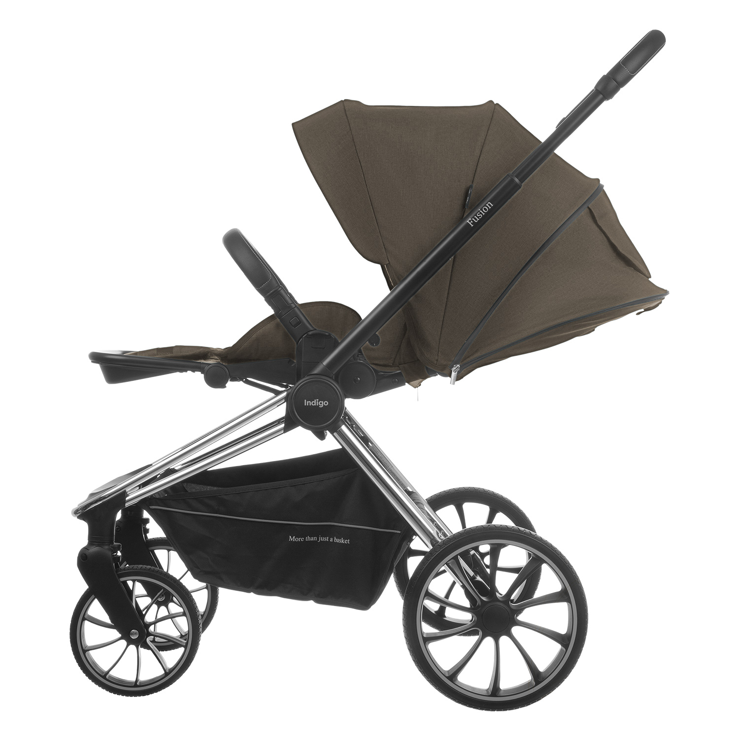 Коляска оснащена защитой от ультрафиолета UV50+ и светоотражающими полосками на корзине, что делает ее заметной в темное время суток. В комплекте с FUSION 2в1 поставляются: москитная сетка, адаптеры для люльки и стильная сумка для мамы.