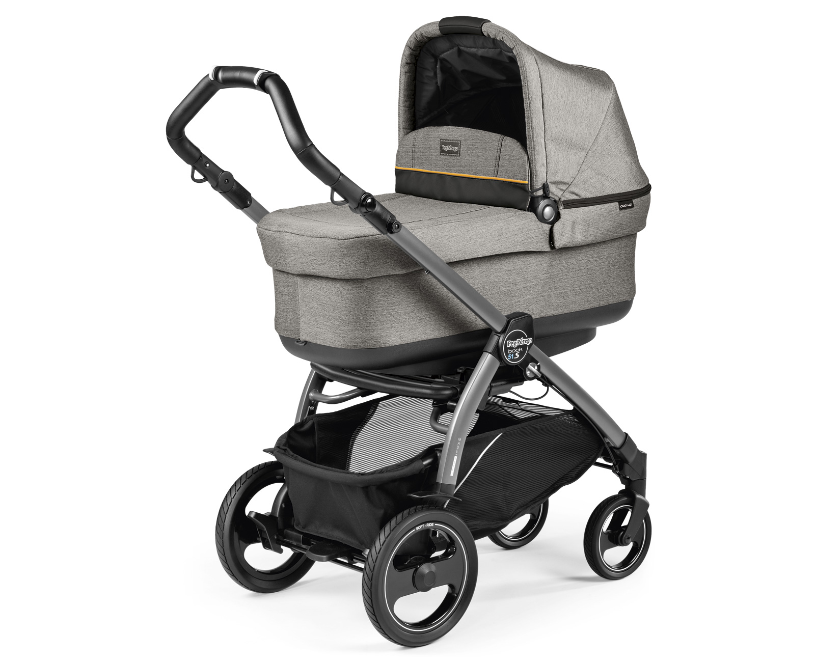 Коляска 3 в 1 Peg-Perego Book 51S Pop-Up Modular System - самый полный модульный комплект итальянского производителя, включающий в себя модернизированное шасси шириной всего 51 сантиметр, а также мягконатяжную люльку для новорожденного, вместительный прогулочный блок и автокресло группы 0+. Возможность простой и быстрой замены всех модулей на шасси позволяет решить практичным родителям проблему выбора транспортных средств для малыша, начиная с самого его рождения и на несколько лет вперёд. Младенцу, в какое бы время года он ни родился, идеально подойдёт всепогодная просторная люлька с регулируемой для создания нужного микроклимата вокруг малыша вентиляцией. Ребёнка постарше уместно пересадить в прогулочную коляску с возможностью реверсивной установки сидения на шасси - лицом к маме или к окружающему миру, в ней и малышу, и родителям будет интересно и комфортно совершать ежедневные прогулки. А когда кроха захочет отдохнуть - к вашим услугам изменяемый в положение для отдыха наклон спинки и большой капюшон, который надёжно укроет маленького пассажира от посторонних глаз, непогоды или жары. Автокресло можно использовать как самостоятельное транспортное средство, установив его на шасси, или непосредственно по назначению, в автомобиле. Тем более, что шасси складывается компактной "книжкой", в том числе вместе с люлькой или прогулочным блоком и помещается в багажник автомобиля, значительно повышая мобильность всей вашей семьи. Увеличенного диаметра колёса с передней поворотной парой обладают отличной маневренностью, а уже упомянутая выше ширина рамы шасси 51 сантиметр - высокой проходимостью, так что коляска без труда пройдёт по любым поверхностям или войдёт в любые стандартные двери.