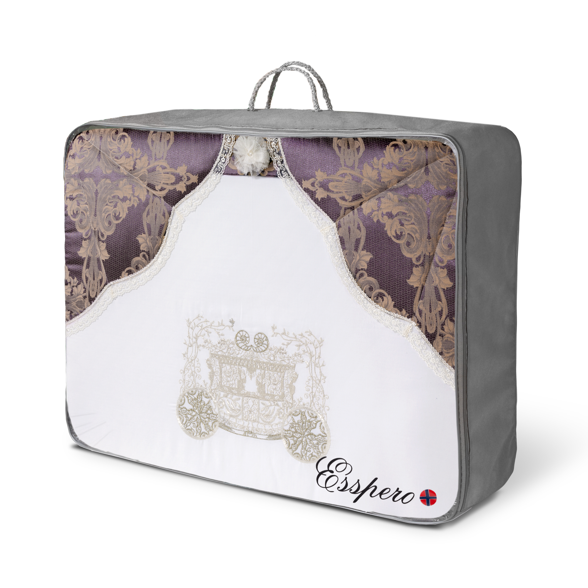 Комплект постельного белья Esspero Imperial, украшенный вышивкой с роскошной каретой и жаккардовыми вставками с изысканным принтом, выполнен из 100% мягкого нежного хлопка. Наполнитель белья - натуральное 100% волокно, которое добывается из зерна кукурузы и применяется для наполнения одеял. Этот материал имеет оптимальную воздухопроницаемость, лучшую, чем многие другие натуральные и синтетические материалы, а значит ребёнку будет исключительно удобно и уютно во время ночного и дневного сна. Комплект со съёмными деталями без труда можно выстирать в стиральной машине. Наполнитель не деформируется, так что комплект всегда будет иметь превосходный вид, даже после многочисленных стирок и глажек. Все материалы прошли необходимые тесты и считаются абсолютно безопасными, то есть, можно быть увереным в том, что малышу будет комфортно в его кроватке на этом постельном белье.