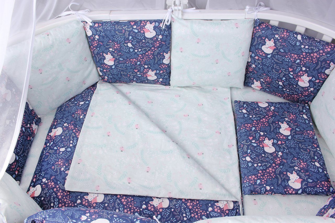 Комплект Premium в кроватку 18 предметов AmaroBaby Лисички – идеально подойдет для Вашего малыша. Производитель позаботился о натуральности, экологической чистоте и гипоаллергенности всех материалов. Для изготовления данного комплекта использовался только 100% натуральный хлопок премиального качества. Ткани устойчивы к частым стиркам, не линяют и долго сохраняют первоначальный внешний вид. В основе дизайна лежит украшение принтами с изображением хитрой лисички в цветах и растительности.