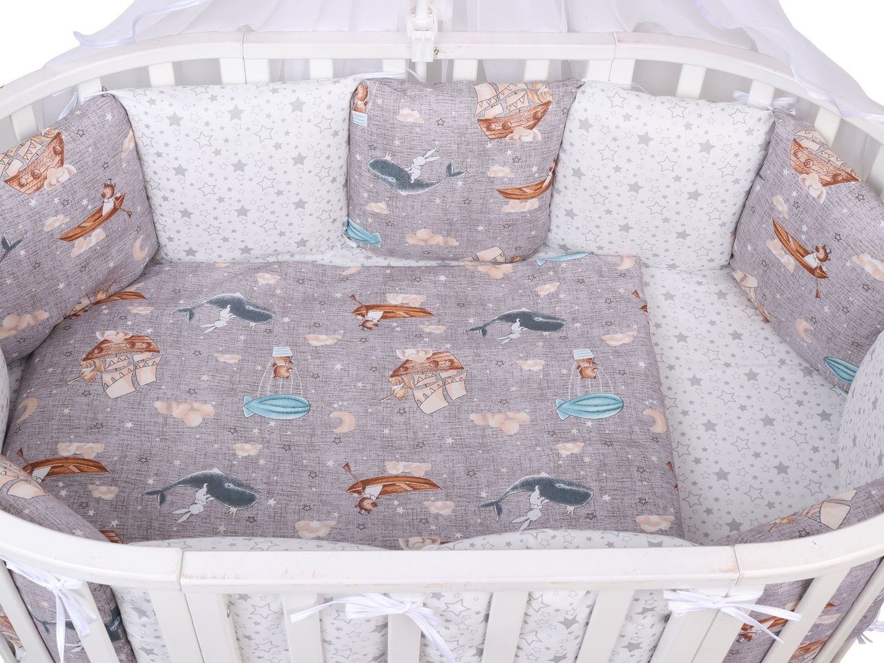 Комплект в кроватку 15 предметов AmaroBaby Путешественники – идеально подойдет для Вашего малыша. Производитель позаботился о натуральности, экологической чистоте и гипоаллергенности всех материалов. Для изготовления данного комплекта использовался только 100% натуральный хлопок премиального качества. Ткани устойчивы к частым стиркам, не линяют и долго сохраняют первоначальный внешний вид. Путешествия всегда притягивали человека. Поэтому производитель разместил в качестве декора сказочных путешественников на воздушных шарах, кораблях и даже на китах.