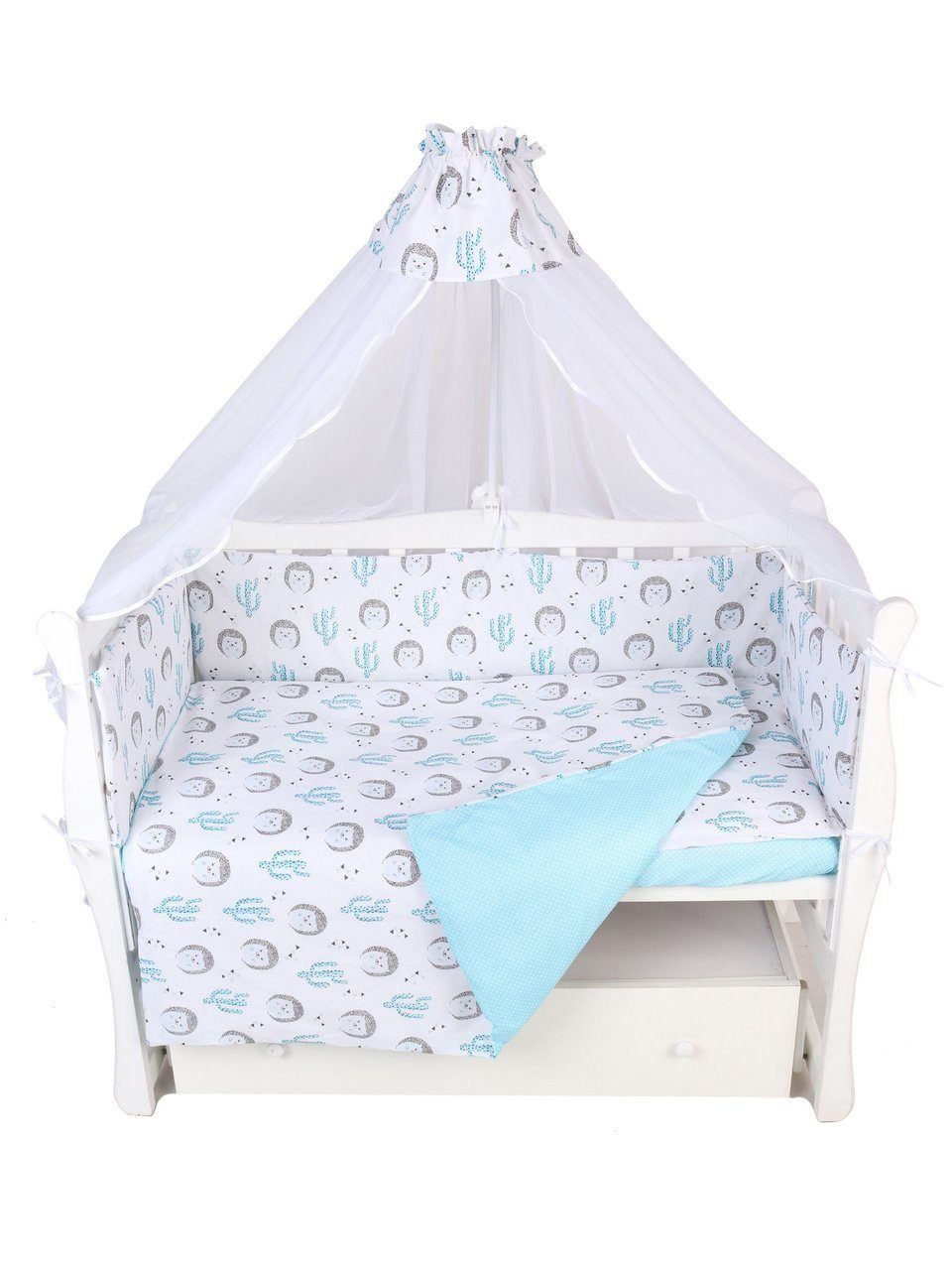 Комплект в кроватку 7 предметов AmaroBaby Ёжики – идеально подойдет для Вашего малыша. Производитель позаботился о натуральности, экологической чистоте и гипоаллергенности всех материалов. Для изготовления данного комплекта использовался только 100% натуральный хлопок премиального качества. Ткани устойчивы к частым стиркам, не линяют и долго сохраняют первоначальный внешний вид. Очаровательные ежики и кактусы стали основой для украшения этого комплекта постельного белья.