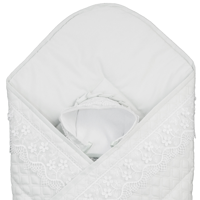 Конверт на выписку от компании Eco Line Скандинавия Люкс Ромб сочетает в себе два основных свойства подобных изделий - изящное оформление и практичность. Первое обеспечивается такими элементами, как кружевная оторочка, вышивка в виде короны и бант. Практичность проявляется в первую очередь в том, что конверт качественно утеплен и надежно защищает малыша от холодов. Для этой же цели вшита специальная шапочка. Стоит отметить, что хлопок, послуживший основным материалом, выращивался в специальных условиях и прошел тщательную обработку. Благодаря этим процедурам ткань безвредна для здоровья младенца и его родителей, не провоцирует раздражение и аллергию.