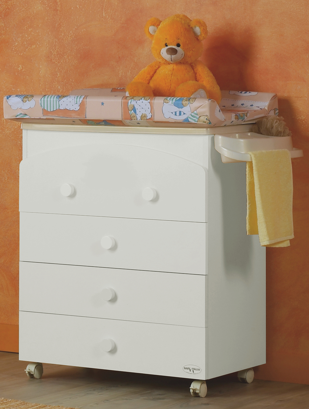 Пеленальный комод Baby Italia Baby Bath – многофункциональная мебель, которая помогает в уходе за ребенком. Изделие выполняет функцию пеленального столика и шкафа для вещей. Кроме того, в комплекте идет съемная ванночка, в которой можно купать малыша. Комод выполнен из материала ДСП и стилизован под дерево. 4 вместительных ящика выдвигаются бесшумно. На верхней части установлен пеленальный стол, на котором можно менять ребенку подгузники или делать массаж. Комод очень мобилен – четыре прорезиненных колесика помогут откатить его в любое место.