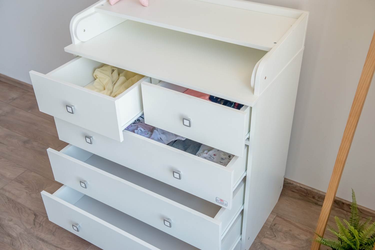 • Комод состоит из 5 ящиков с эргономичными ручками.