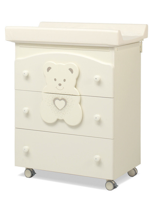 Особенности пеленального комода с ванночкой Erbesi Tiffany: необычайно изысканный и оригинальный, он непременно придется по вкусу как всем современным родителям, так их капризным малышам. Комод оснащен откидной пеленальной доской и ванночкой. Он состоит из трех вместительных выдвижных ящиков с бесшумным механизмом работы. Оснащен четырьмя колесиками со стопорной системой. Пеленальная доска и ванночка могут быть убраны, когда в них отпадет необходимость. Выполнен в общем стиле коллекции Erbesi Tiffany, декорирован аппликацией в виде милого медвежонка, инкрустированного сверкающими стразами. Комод идеально впишется в интерьер любой современной детской комнаты, сделав его еще более органичным и завершенным.