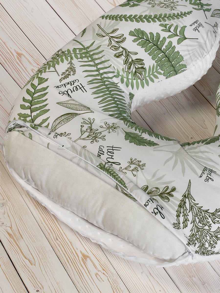 Подушка для беременных Amarobaby 340х72 Папоротники – эксклюзивная анатомическая подушка для беременных. Из-за своей особой формы в виде «восьмерки» она станет незаменимым спутником будущей мамы. Одна сторона подушки из мягкого и нежного плюша минки, другая – из натурального 100% хлопка. В качестве наполнителя производитель использует безопасный и уникальный материал Файбер. Он прекрасно пропускает воздух и сохраняет тепло. Внешнее покрытие обладает хорошей износоустойчивостью к стиркам.