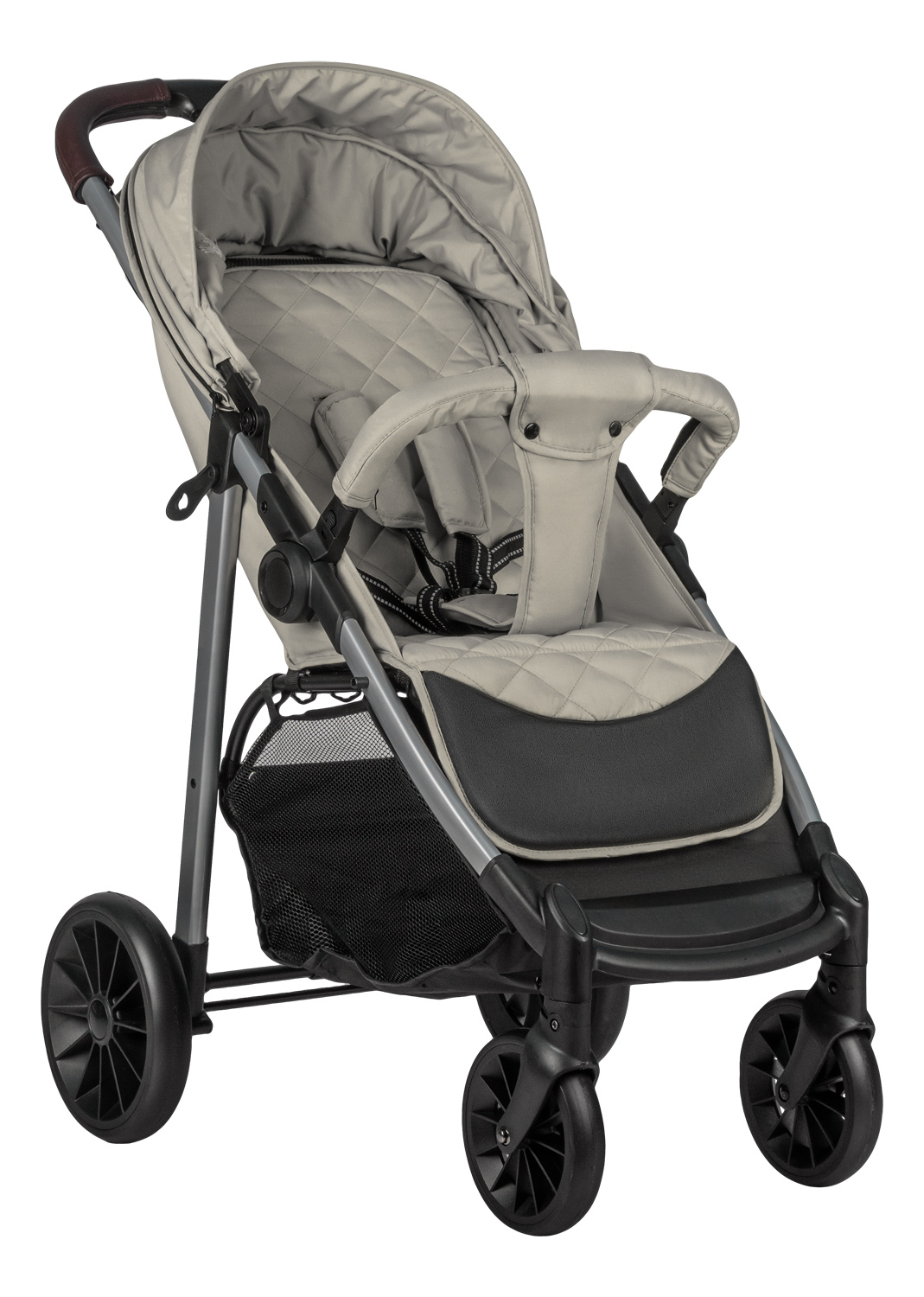 - Наличие мощных пружинных амортизаторов и вращение передних колес на 360° позволяет преодолевать неровные поверхности играючи. При необходимости передние колеса можно зафиксировать. Передние колёса легко снимаются, что значительно облегчает уход за ними после прогулок.