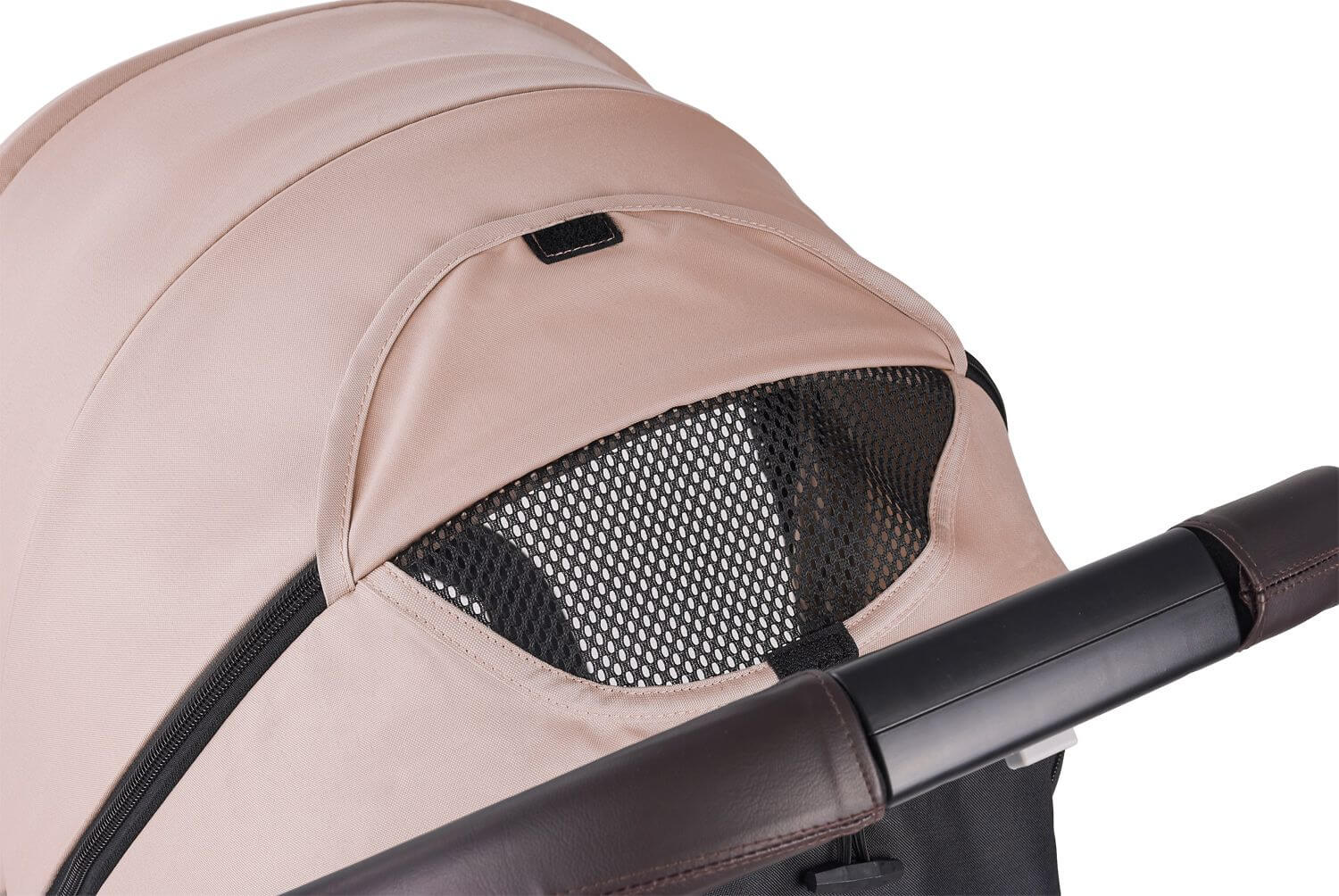 - Продуманная система вентиляции в виде большого окна с москитной сеткой спрятана под двумя скрытыми молниями, в жаркие дни она позволяет свежему воздуху беспрепятственно попадать внутрь коляски.
