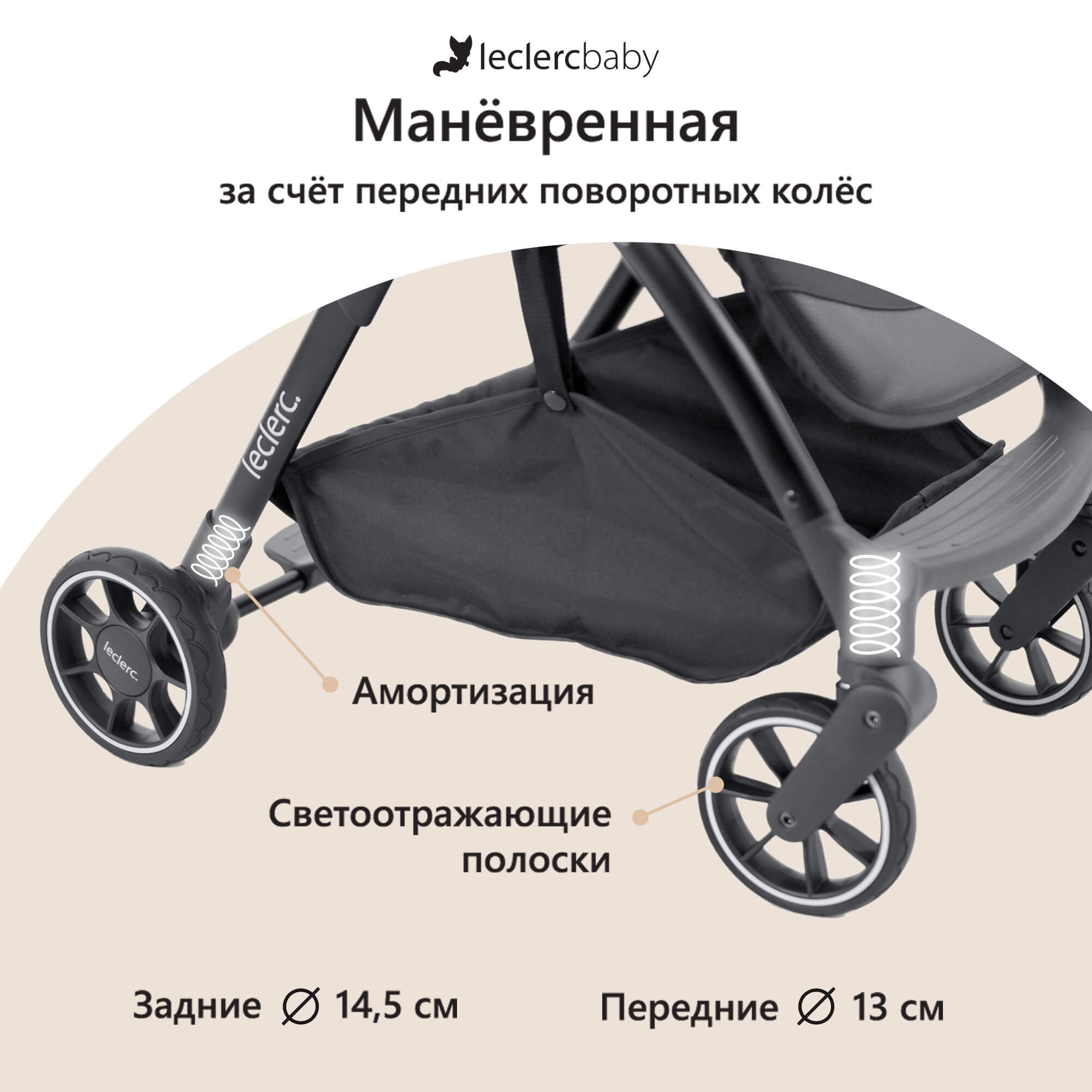 Все колёса подвижные и позволяют с легкостью маневрировать в городе или на просёлочной дороге. Вместительная корзина позволит взять всё необходимое для прогулки с ребёнком на открытом воздухе. Путешествуйте вместе с Leclerc Baby, продолжайте двигаться и что бы вы ни делали: «Делайте по-своему!».