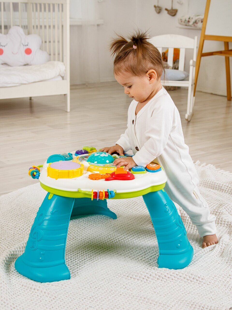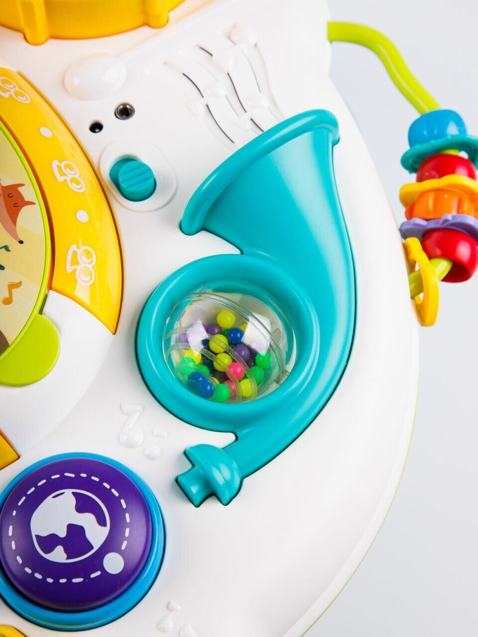 Яркий многофункциональный развивающий столик предназначен для малышей от 3 месяцев. Музыкальный столик развивает мелкую моторику рук, координацию движений, воображение, сенсорное и визуальное восприятие, музыкальный слух. Эта интерактивная игрушка оснащена ярким пианино с разными режимами звучания. Музыкальная игрушка оснащена микрофоном на проводе, который подключается к пианино. Интерактивный столик - замечательная игрушка для познания различных материалов и развития мелкой моторики у самых маленьких. Столик очень яркий, с множеством интерактивных и объемных элементов - прекрасная развивающая игрушка для вашего малыша.