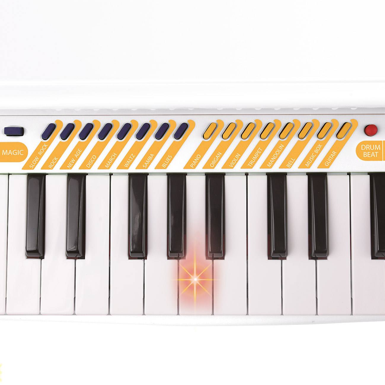 Рояль со стульчиком Weina-2105 - интересная развивающая игрушка для детей от 3-х лет с 19 демомелодиями, функциями записи и воспроизведения. Есть гид по клавишам, который поможет играть мелодии, следуя за ним. Для игры необходимы 4 АА-батарейки, 1.5 вольтт.