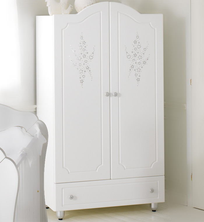 Шкаф Baby Expert Diamante имеет две створки, четыре полки и расположенный внизу выдвижной ящик, оснащенный доводчиками. Он сделан из натуральных материалов, покрыт краской на водной основе и украшен аппликациями из стразов. Дверцы имеют возможность открытия на 110 градусов благодаря шарнирам. Ножки шкафа снабжены резиновыми наконечниками, которые берегут покрытие пола. Между дном модели и полом оставлен достаточно большой зазор, позволяющий производить под ним уборку, не передвигая шкаф. Система Easy Fix делает возможной легкую и быструю сборку Baby Expert Diamante без применения инструментов. Модель представлена в двух цветовых вариантах – белом и кремовом.