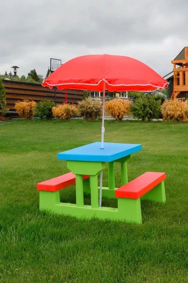 Садовый детский стол с зонтиком - идеальное решение для создания уютной и комфортной зоны отдыха и игр для ваших малышей!<br/><br/>Детский столик с лавочками - это не просто мебель, это настоящий оазис веселья и творчества прямо у вас в саду или на террасе. Размер стола: 67x41x47(H) см. Размер скамеек:67x15.5x24(H) см.<br/><br/>Вот почему он станет незаменимым аксессуаром для вашей семьи:<br/><br/>1. Безопасность и надежность: Мы уделяем особое внимание качеству и безопасности нашей продукции. Комплект детской мебели изготовлен из прочного и гипоаллергенного пищевого пластика, который не только выдерживает интенсивное использование, но и обеспечивает стабильность и безопасность во время игр и активного времяпрепровождения детей.<br/><br/>2. Удобство и функциональность: Наш садовый детский стол с лавочками и зонтом имеет простую и интуитивно понятную конструкцию, которая легко собирается и разбирается. Он компактен и легок в транспортировке, поэтому вы можете брать его с собой на пикники или на дачу. Зонт позволит использовать комплект жарким днем, чтобы избежать солнечного удара и поможет укрыться в легкий дождь.<br/><br/>3. Красочный и привлекательный дизайн: Садовая мебель детская выполнена в ярких и привлекательных цветах, которые привлекут внимание детей. Дети будут с удовольствием проводить время за столом, играя, рисуя, читая книги или просто общаясь с друзьями.<br/><br/>4. Долговечность и устойчивость к погодным условиям: Комплект детской мебели изготовлен из пищевого пластика устойчив к воздействию солнца, дождя и других погодных условий. Вы можете быть уверены, что он прослужит Вам долгие годы, сохраняя свою яркость и привлекательность.<br/><br/>С садовым комплектом детской мебели Вы легко сможете создать идеальное место для игр и отдыха в саду, чтобы Ваши малыши наслаждались безмятежными моментами счастья и веселья на свежем воздухе!
