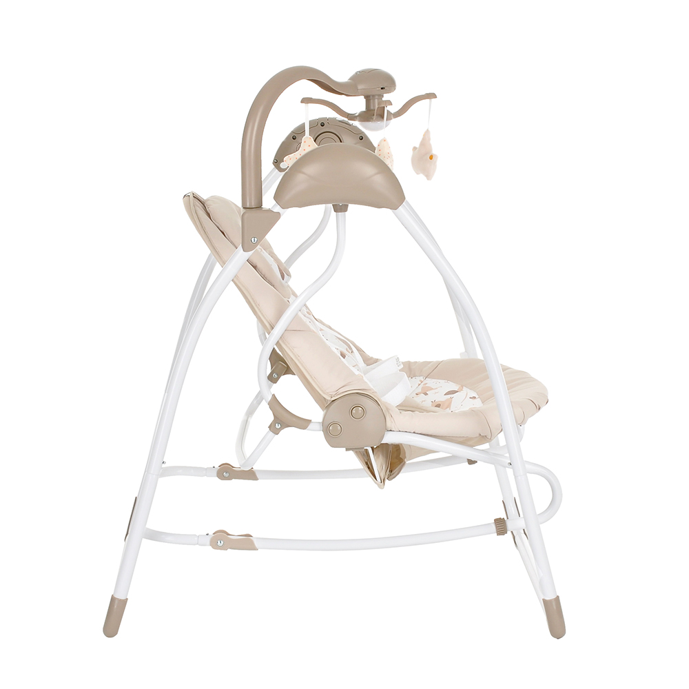 Электрокачели имеют три высоты положения спинки, также можно использовать как шезлонг отдельно от качелей. Для удобства и безопасности малыша предусмотрены мягкий подголовник и пятиточечные ремни безопасности. Электрокачели оборудованы съемным столиком с удобным углубление под бутылочку или поильник для водички.