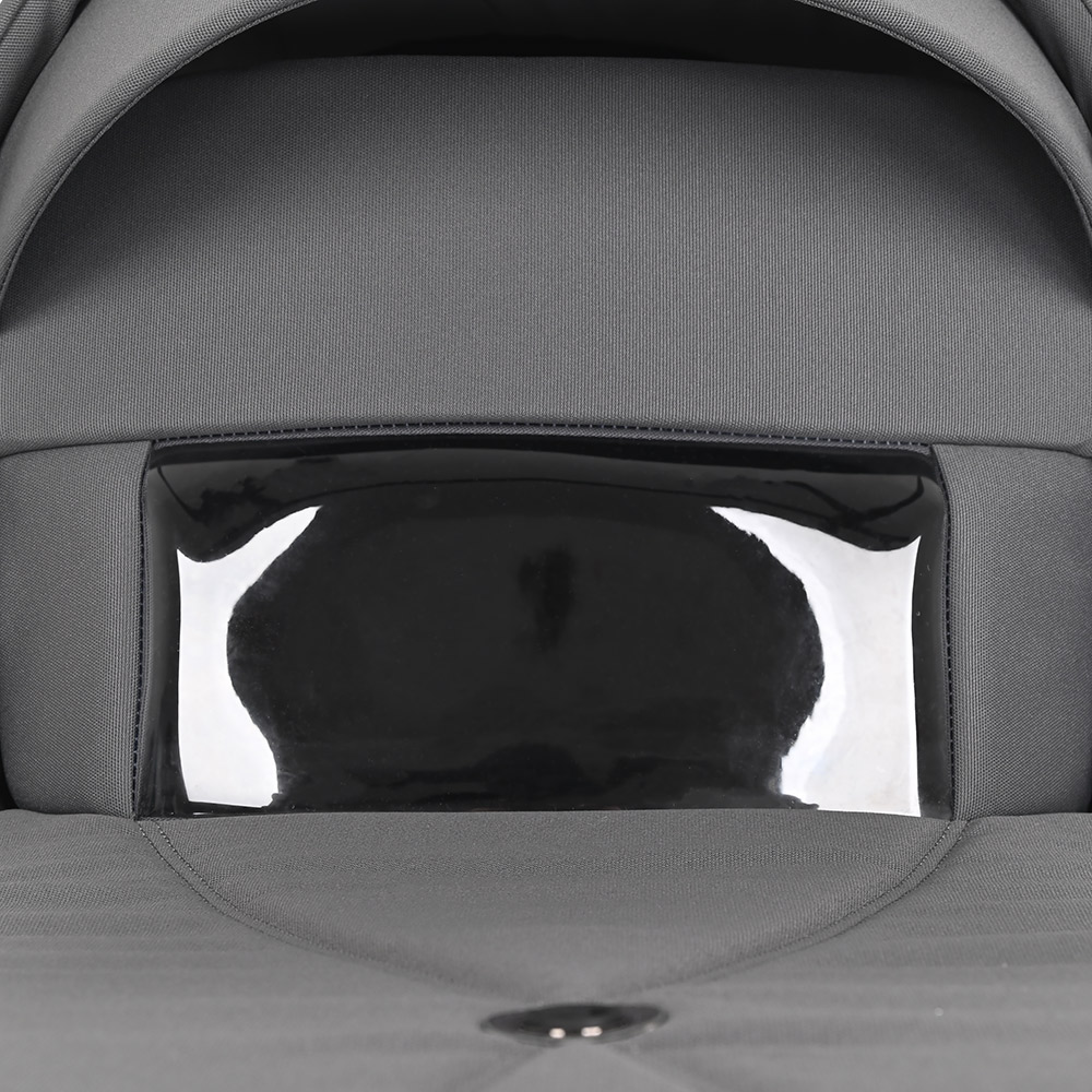 - Капор имеет жёсткое крепление к люльке, на нём находится ручка для переноски люльки, в раскрытом положении он фиксируется, для сложения необходимо нажать кнопки с двух сторон. В капор встроена антимоскитная сетка и дополнительный козырёк для защиты от солнца и дождя.