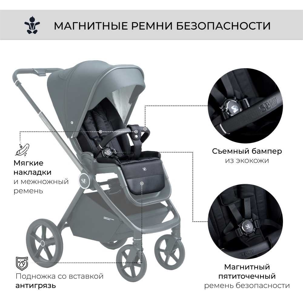 - За безопасность ребёнка отвечают пятиточечные ремни с магнитным замком и дополнительно — межпаховая перемычка.