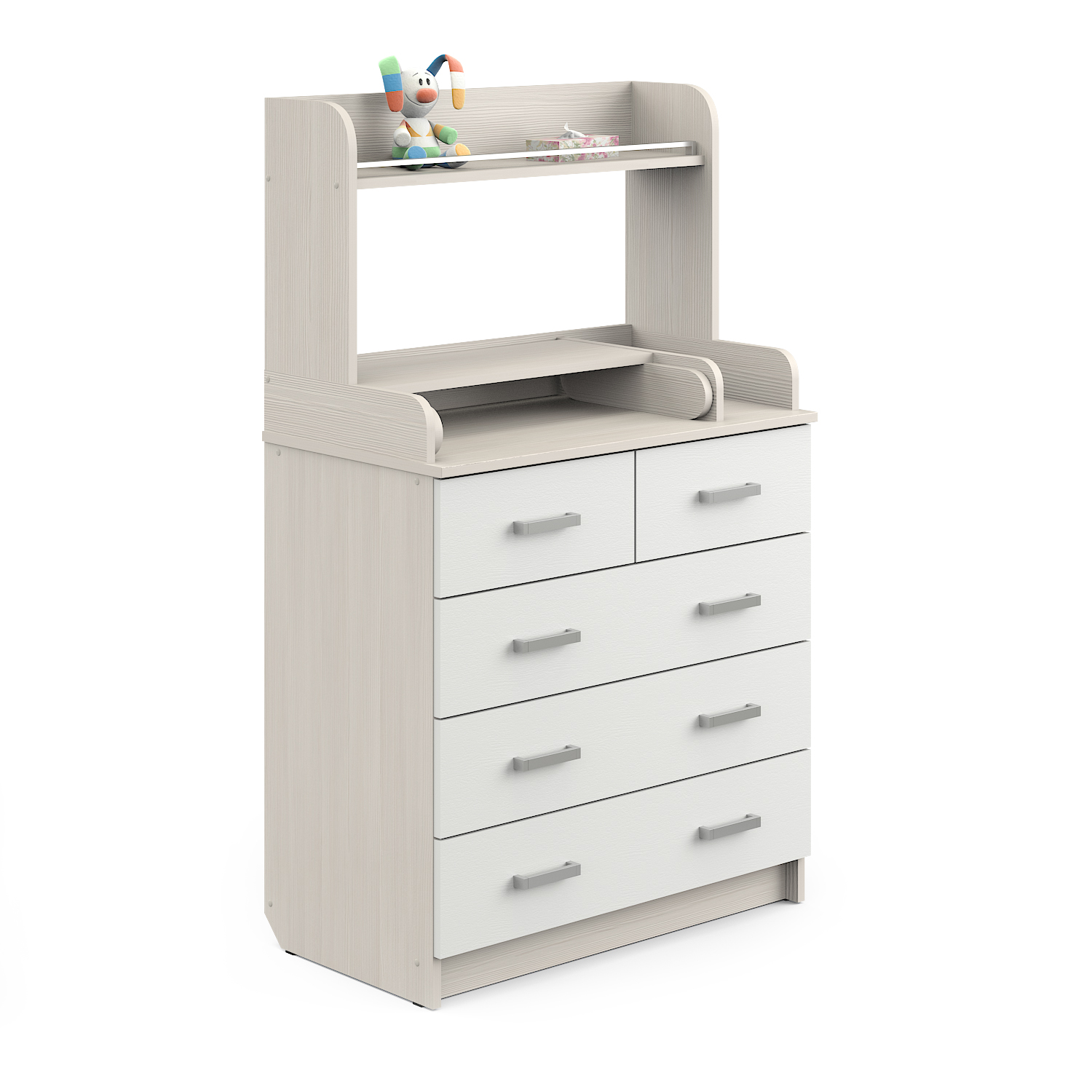 Удобный пеленальный комод, оборудованный надстройкой с полкой. Ограничитель не позволит предметам скатиться с полки. Рядом с пеленальным столиком есть отделение для предметов по уходу за ребенком.