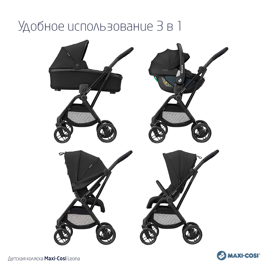 Leona можно использовать с рождения в сочетании с совместимыми люльками (Короб Maxi-Cosi Carrycot Oria) и детскими автокреслами Maxi Cosi.