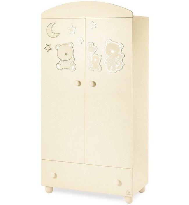 Двухстворчатый шкаф состоит из двух отделений. Отделения для верхней одежды оснащены металлической штангой. Прочие вещи размещаются в остальных отделениях, оснащенных большими полками. В нижней части также есть выдвижной ящик, в котором удобно хранить крупные вещи – постельные принадлежности, сезонные вещи малыша или многочисленные игрушки.