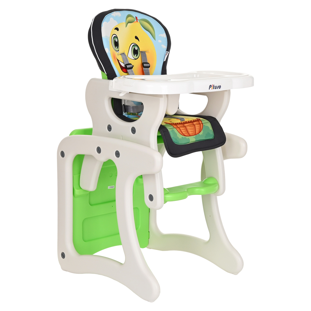 В собранном виде может быть высоким стульчиком для кормления со съемным регулируемым столиком и 5-точечными страховочными ремнями безопасности. Спинка стула регулируется, что позволяет ребенку вздремнуть после сытной трапезы. Трансформируется в отдельную комбинацию – стол + стул, за которым Вашему малышу будет интересно играть и заниматься творчеством.